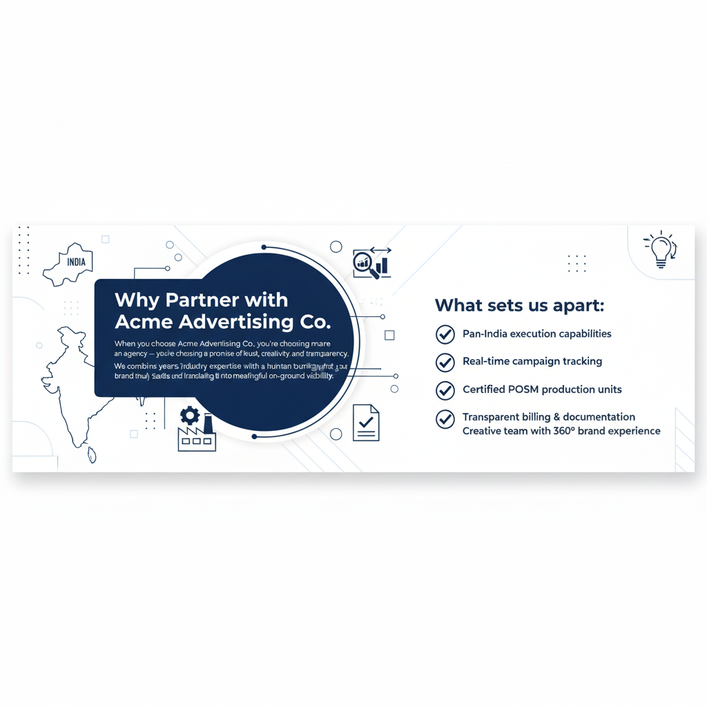 At Acme Advertising Co., every installation or campaign is backed by a Brand Verification Certificate — supported with real-time proof images, GPS tracking, and newspaper validation. This ensures zero scope for misrepresentation and complete client confidence.