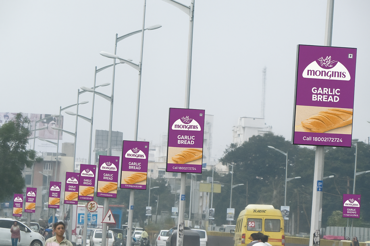 A row of digital pole kiosk advertising companies in Lucknow displaying advertisements for 'Monginis Garlic Bread,' showcasing images of garlic bread slices, set along a busy highway.
