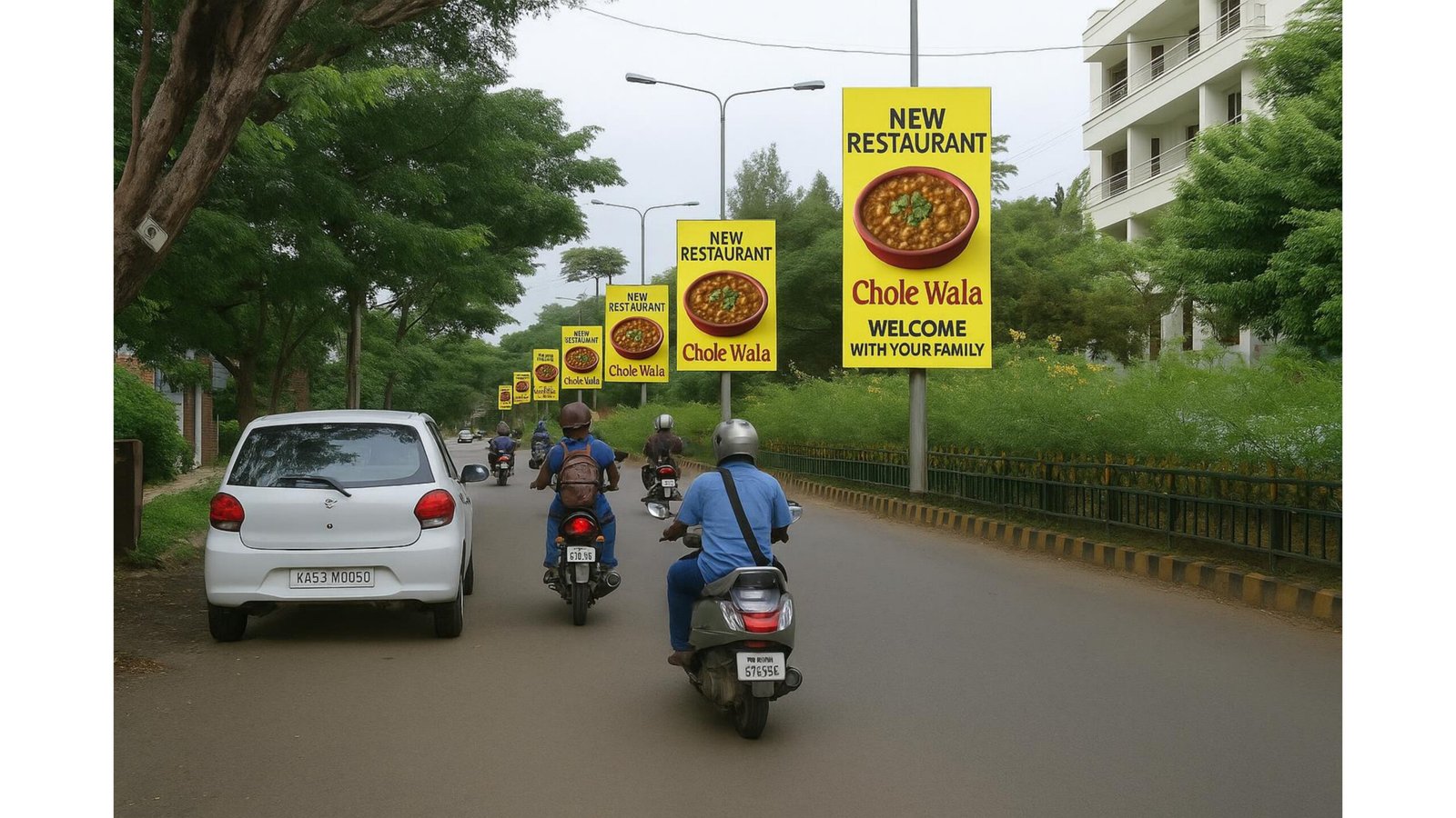 Yellow pole kiosk advertising companies in Lucknow banners by ACME Advertising Co. showing a bowl of chole and text “New Restaurant – Chole Wala – Welcome With Your Family” on urban street poles.